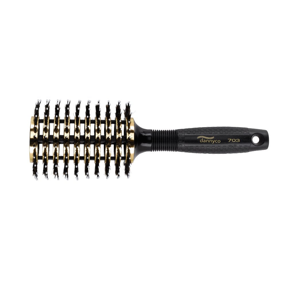 Cette brosse est composée de poils de sanglier entièrement naturels renforcés à l'aide de poils de nylon à bouts arrondis et possède manche en caoutchouc plissé